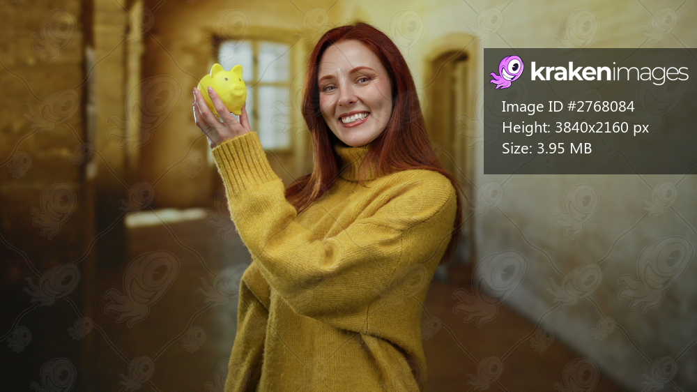 Woman smiling at yellow piggy bank in old university setting shows financial planning concept.