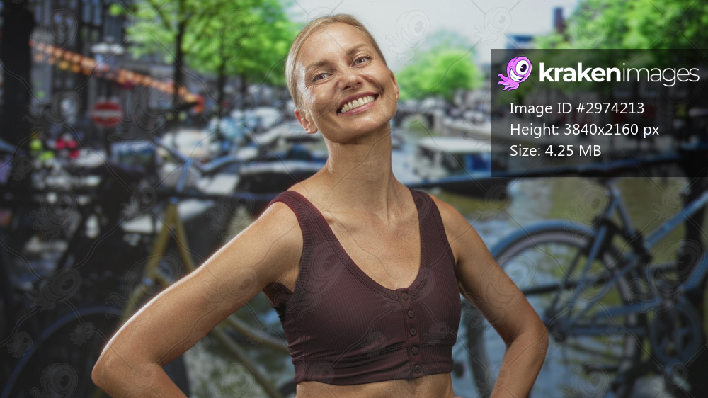 Woman smiling with bare midriff and hands on hips in a street scene with bicycles and canal; confidence wellness energy.