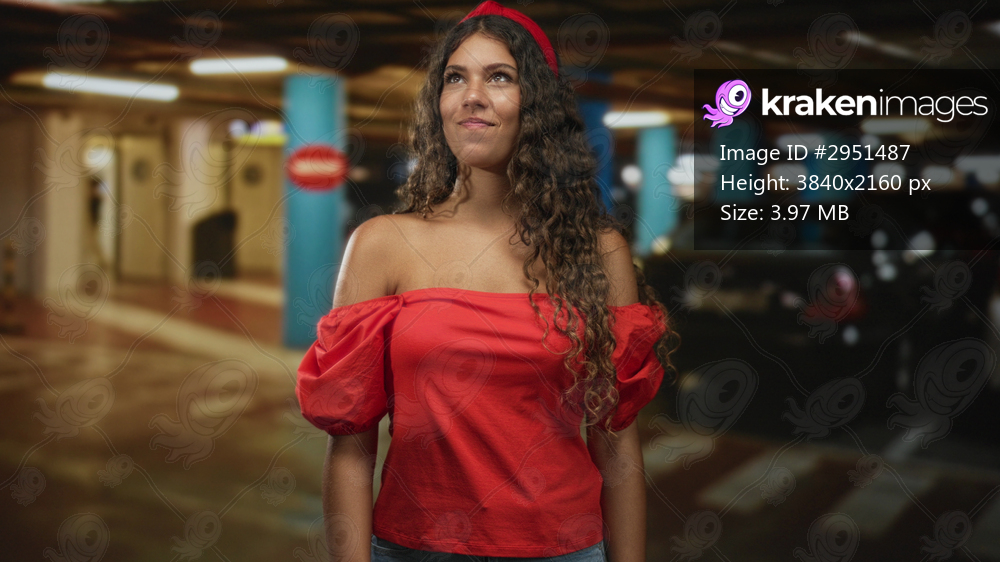 Woman smiling with bare shoulder in red off shoulder top inside a parking garage with parked cars and blue columns; joy youthful confidence.