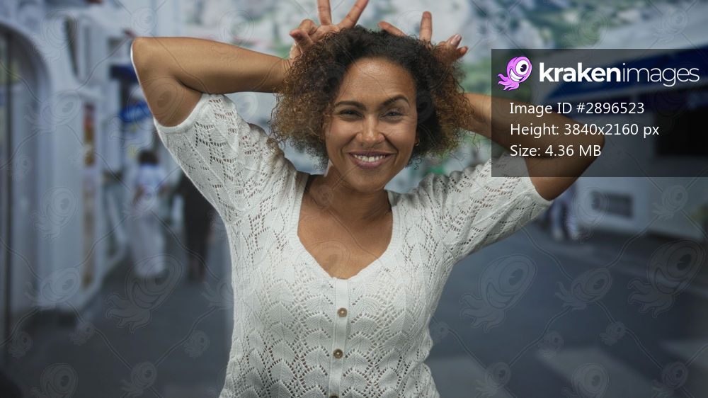 Woman smiling with bare shoulders, arms raised and fingers lifted behind head on a street; playful confidence.
