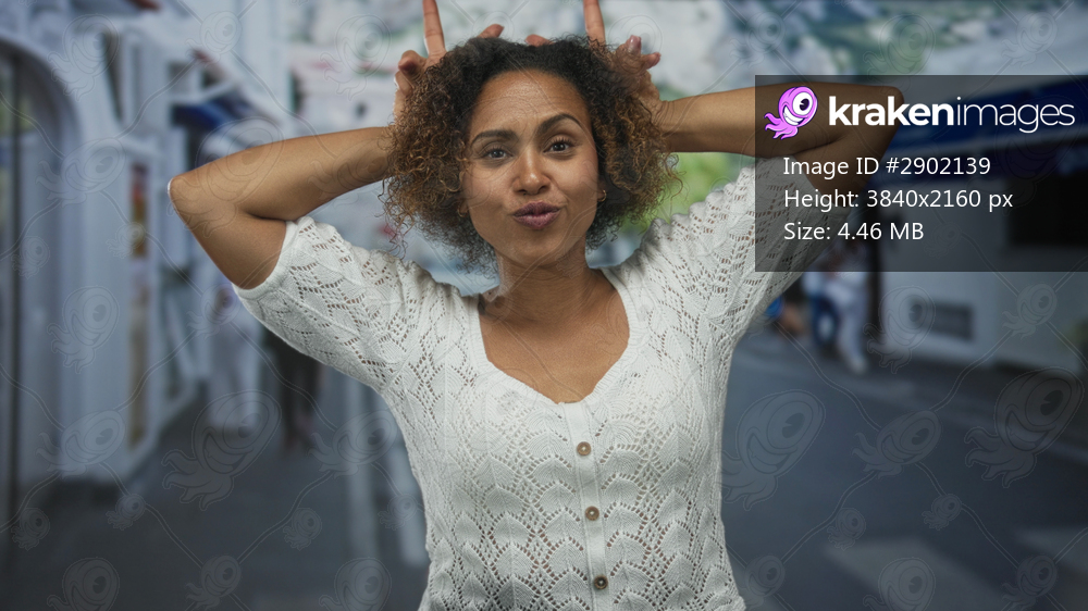 Woman smiling with bare shoulders, arms raised and fingers lifted behind head on a street; playful confidence.