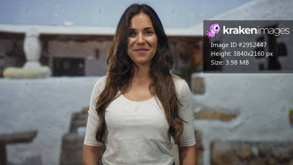 Woman smiling with bare shoulders and long hair standing at a white stucco building entrance in an outdoor courtyard, wearing white top; warm friendly happiness. - Kraken Images