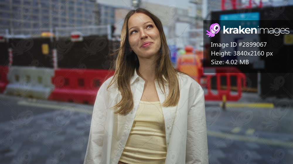 Woman smiling with bare shoulders and relaxed head tilt near red construction barriers on a street construction site; contentment.