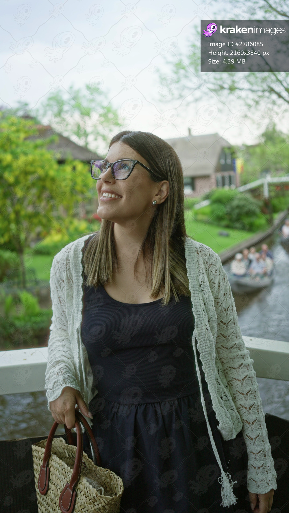 Woman smiling beside a canal in giethoorn, netherlands, holding a bag, wearing glasses and a cardigan, with lush greenery and traditional houses in the background. - Kraken Images