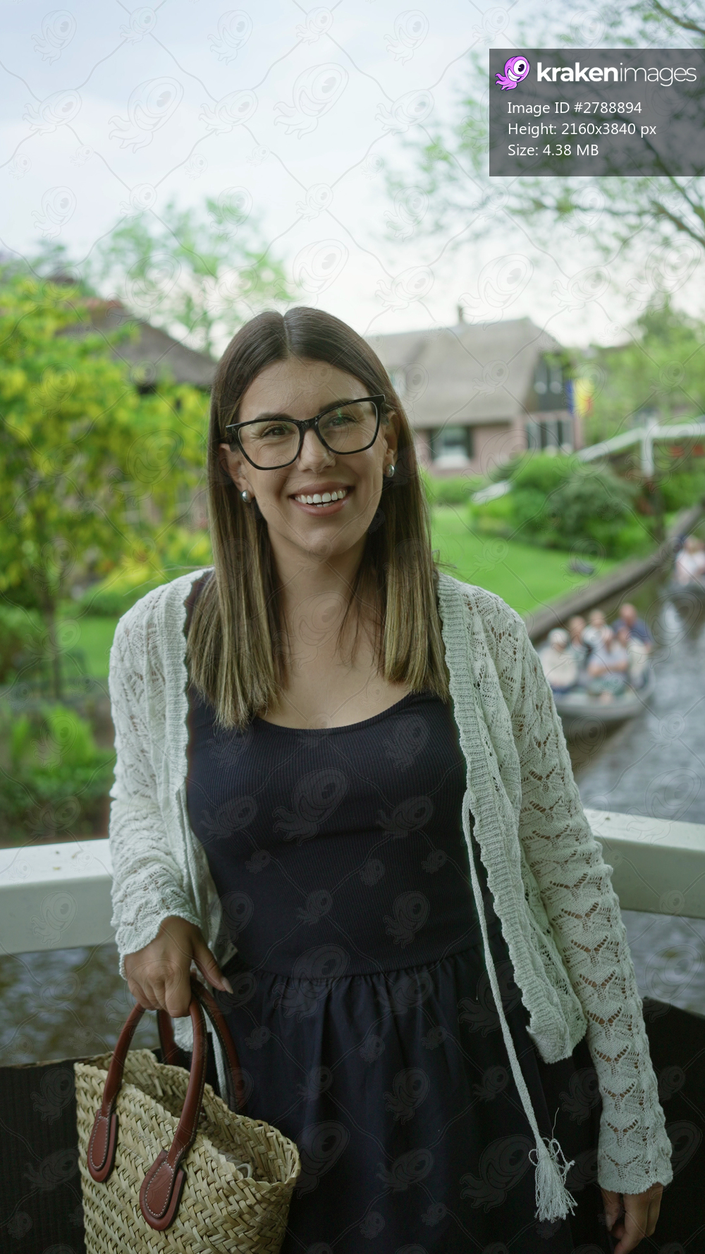 Woman smiling beside a canal in giethoorn, netherlands, holding a bag, wearing glasses and a cardigan, with lush greenery and traditional houses in the background. - Kraken Images