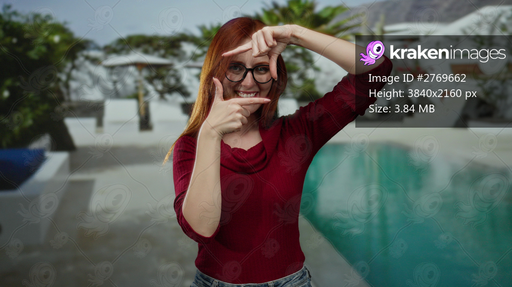 Woman smiling beside a pool at a resort hotel, framing her face with her hands, showcasing a casual and relaxed atmosphere.