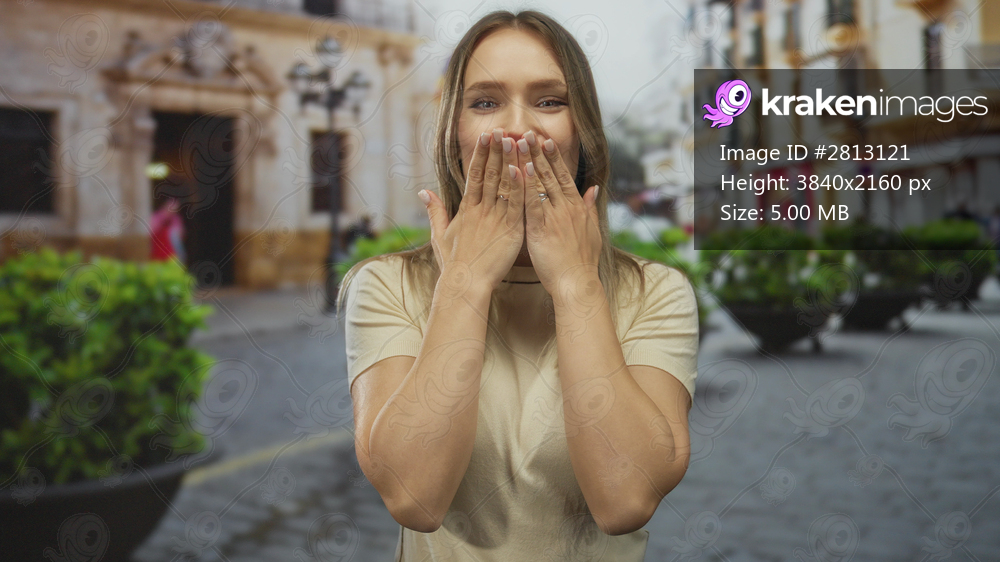 Woman smiling and blowing a kiss at the camera in a vibrant city street scene featuring classic architecture and lush greenery.