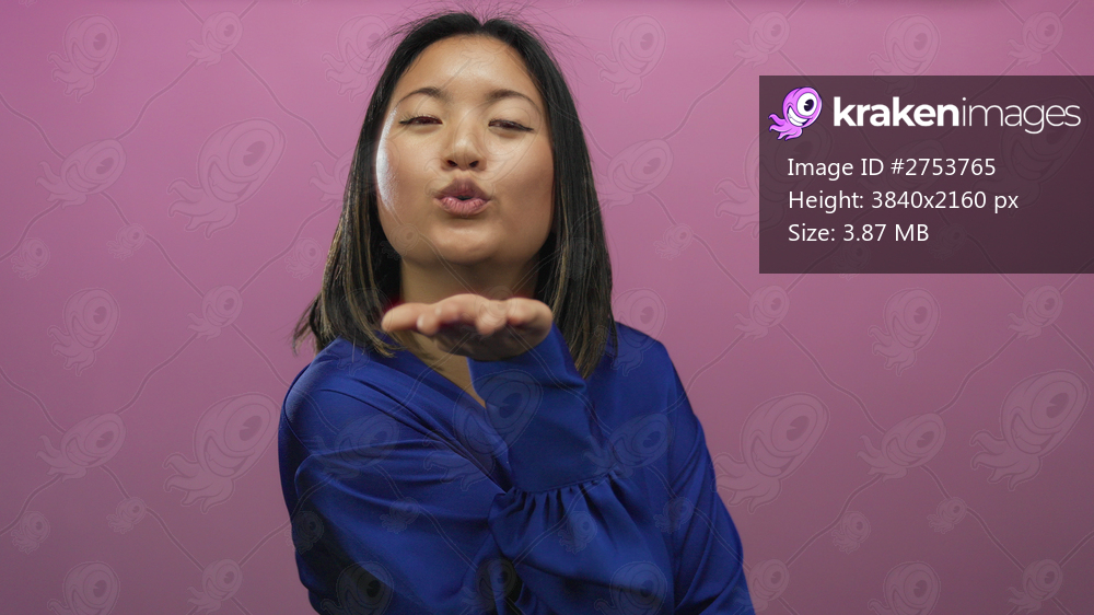 Woman smiling and blowing kiss in blue shirt against vibrant pink background showcases young cheerful expression in studio setting