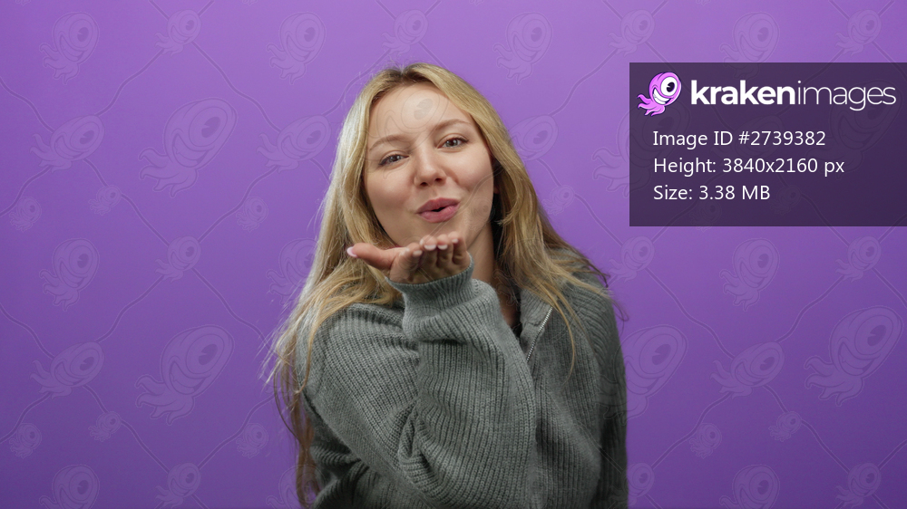 Woman smiling blowing kiss wearing sweater against isolated purple background