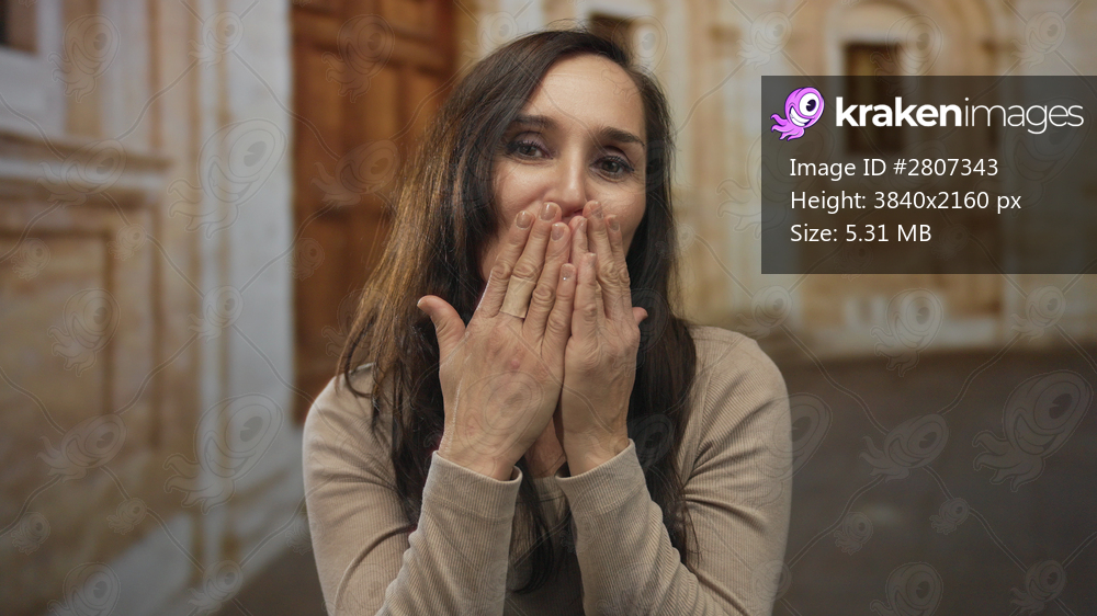 Woman smiling and blowing kisses in an old town street, showcasing happiness and warmth, set against a charming, historic outdoor backdrop.