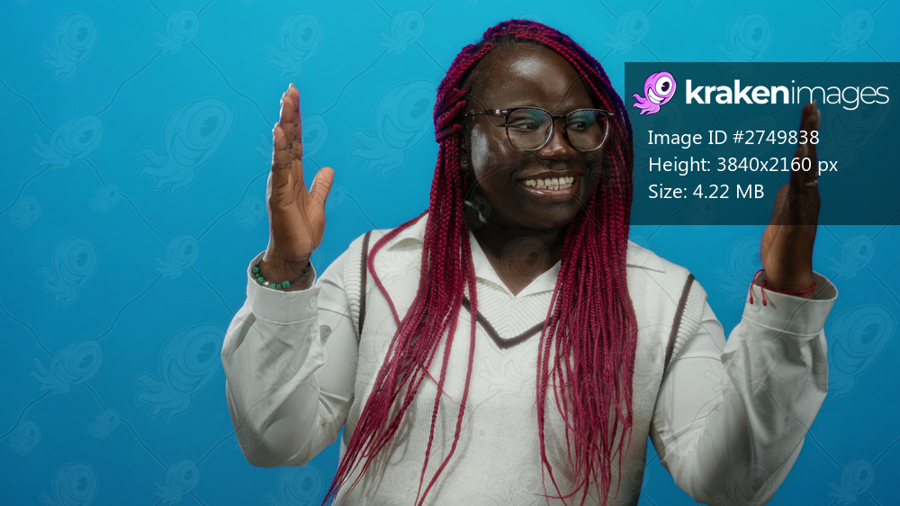 Woman smiling with braided hair gesturing size over blue background wearing glasses and white shirt highlighting her cheerful expression and vibrant style. - Kraken Images