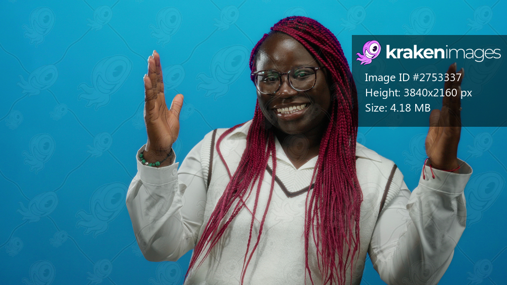 Woman smiling with braided hair gesturing size over blue background wearing glasses and white shirt highlighting her cheerful expression and vibrant style. - Kraken Images