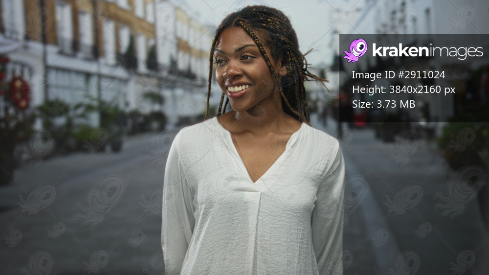 Woman smiling with braided hair and nose ring standing on a city street in front of shops wearing white blouse and relaxed posture; confidence.