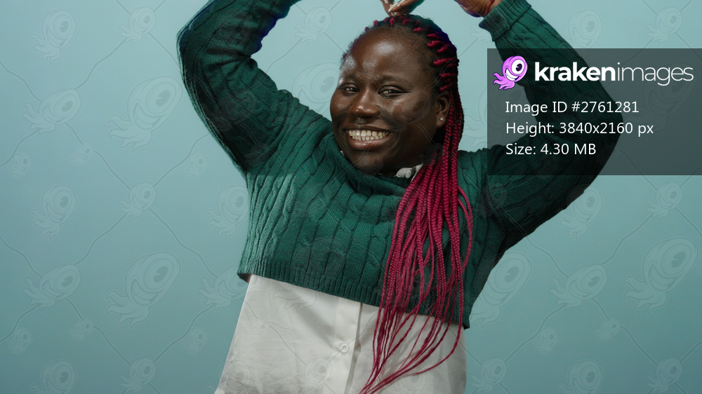 Woman smiling with braids in green sweater over isolated blue background, exuding joy and warmth.