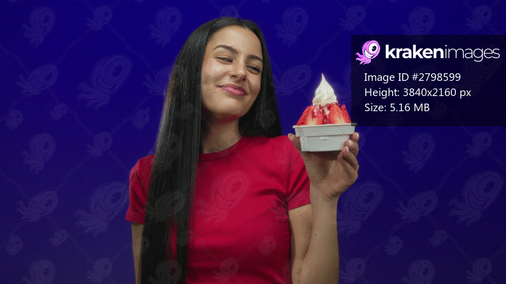 Woman smiling brightly in red shirt holding dessert against isolated blue background, capturing a youthful and joyful moment with strawberries and cream. - Kraken Images