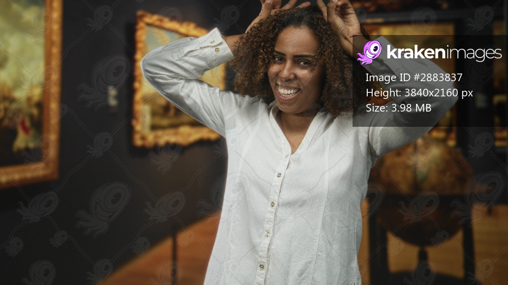 Woman smiling broadly, hands making playful bunny ears on head near framed paintings in building; joy curiosity.