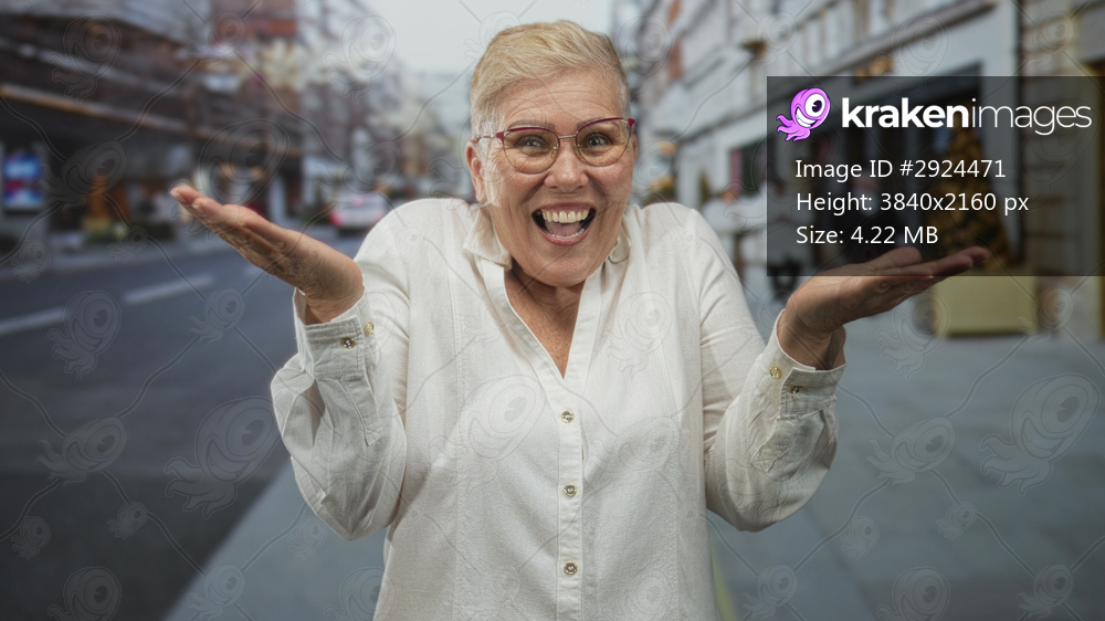 Woman smiling broadly with hands raised palms up on a busy city street, face framed by glasses and open white shirt; surprise joy.