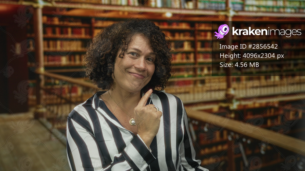 Woman smiling broadly pointing finger at bookshelf in building with curly hair; learning growth confidence.