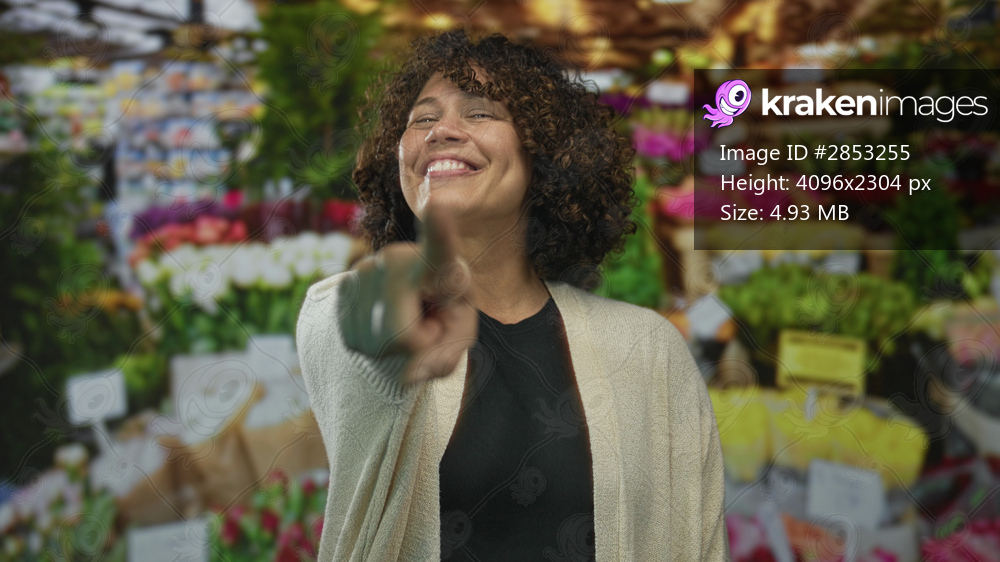 Woman smiling broadly and pointing finger directly at camera in sunlit street; invitation connection warmth.