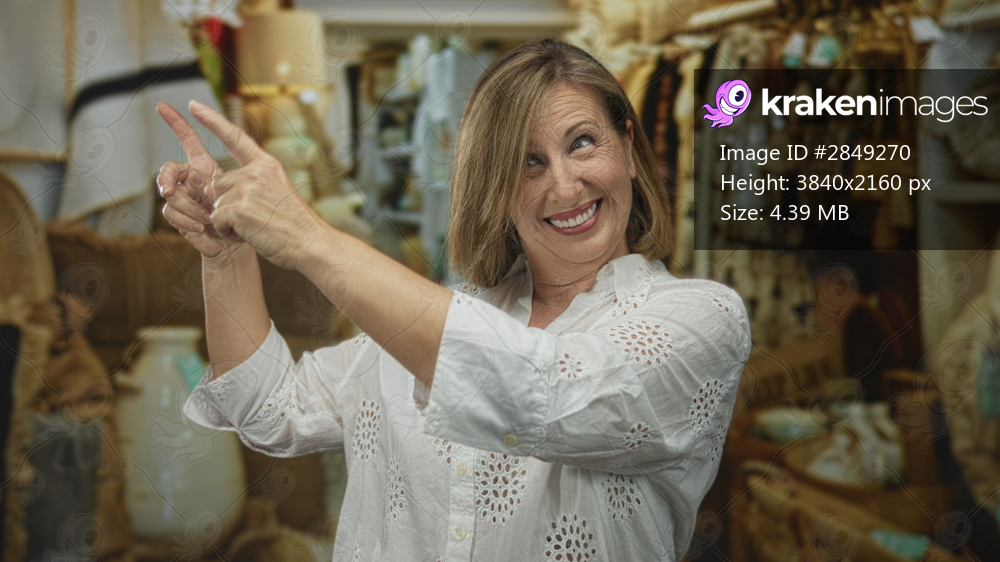 Woman smiling broadly and pointing fingers upward at clothes racks in a building full of garments and decor items; joy.