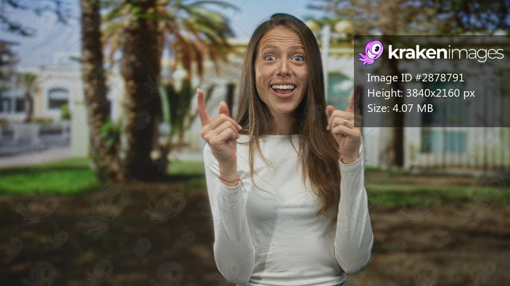 Woman smiling broadly points both index fingers at camera while standing in a park with palm trees and green lawn; joy.
