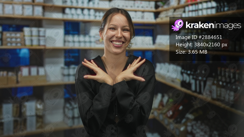 Woman smiling broadly and pressing hands to her cheeks in a pharmacy aisle with shelves of bottles and boxes; warm gratitude.