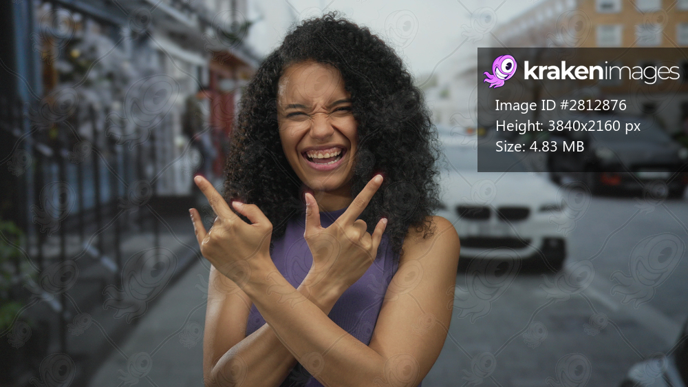 Woman smiling broadly showing rock horns gesture with both hands on bustling street lined with buildings; fun energy.