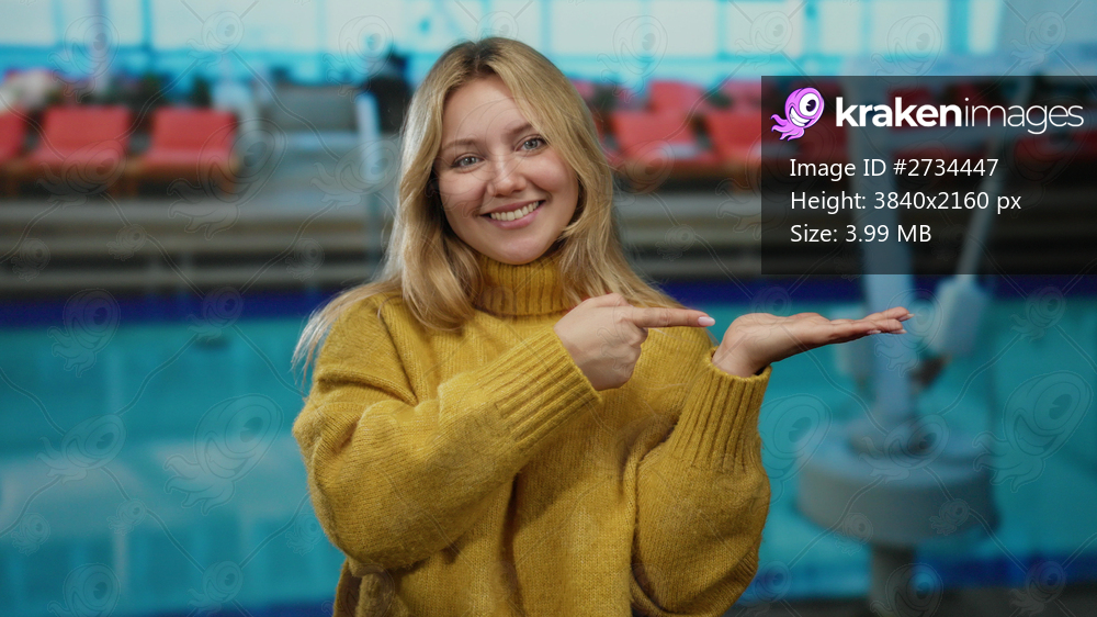 Woman smiling by pool in resort pointing at open hand wearing yellow sweater relaxed outdoor atmosphere.