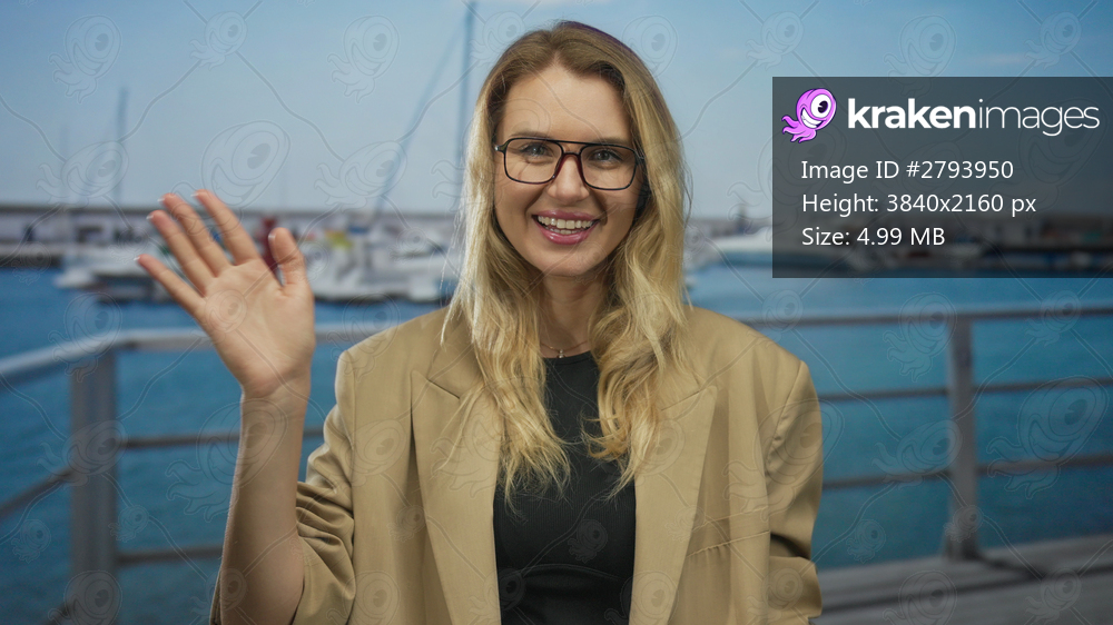 Woman smiling by sea on boat at sunny port outdoors wearing glasses and blazer, waving hand with visible yachts and harbor background.