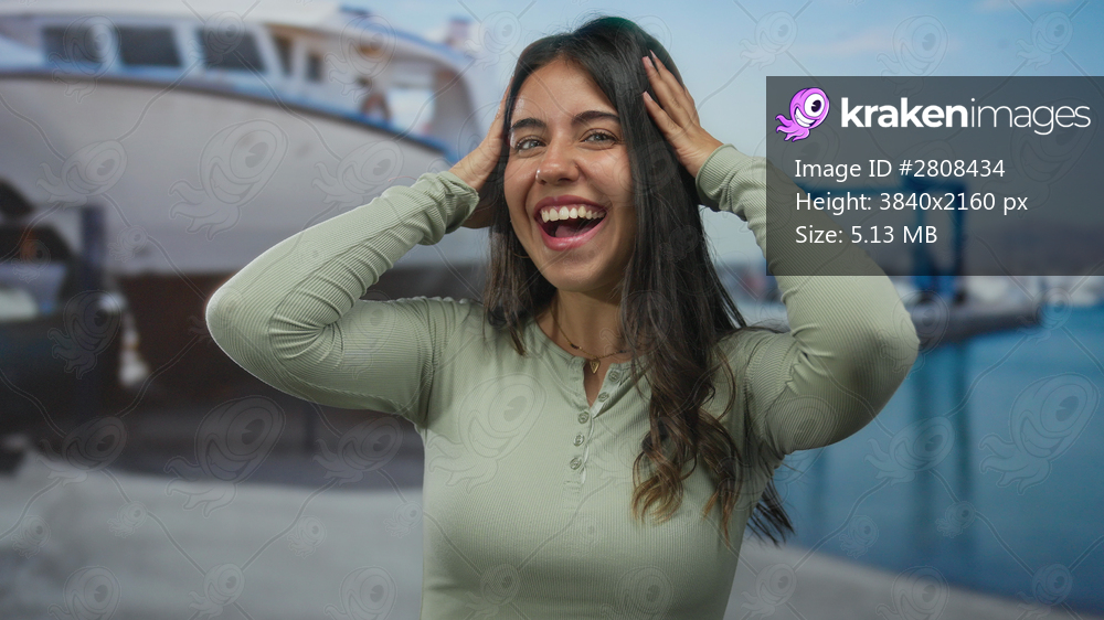 Woman smiling by seaside boat port outdoors young hispanic happy casual hair water