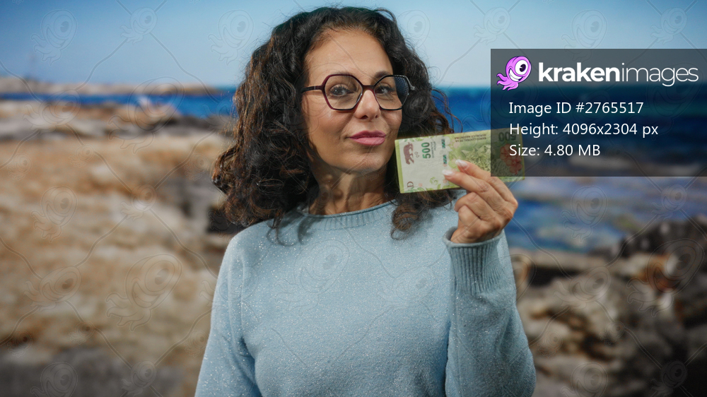 Woman smiling by seaside holding argentine pesos, wearing glasses with curly hair, capturing the joy of travel, finance, and vacations.