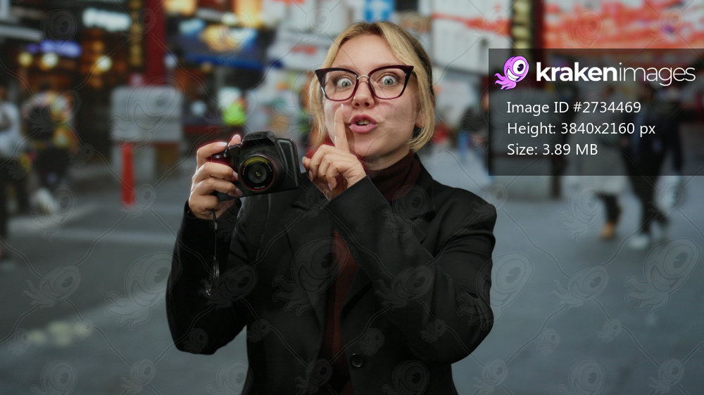 Woman smiling with camera on city street making secret gesture outdoors in bustling urban area suggesting intrigue and candid photography in a dynamic setting. - Kraken Images