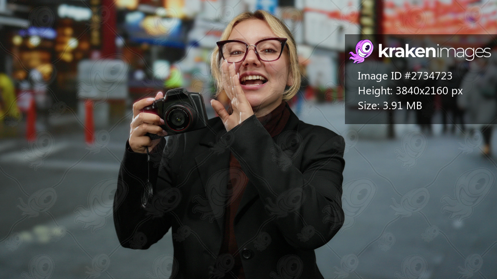 Woman smiling with camera on city street making secret gesture outdoors in bustling urban area suggesting intrigue and candid photography in a dynamic setting. - Kraken Images
