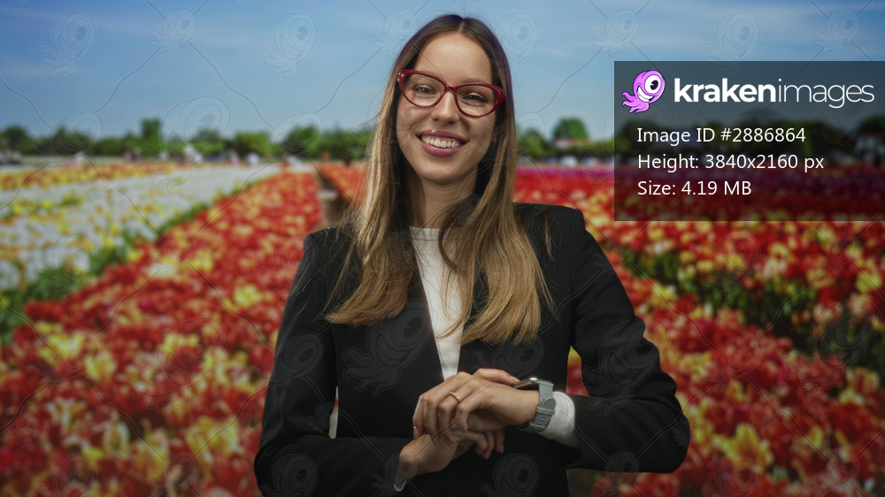 Woman smiling and checking watch with hands visible and red glasses in studio tulip field; confident presence.