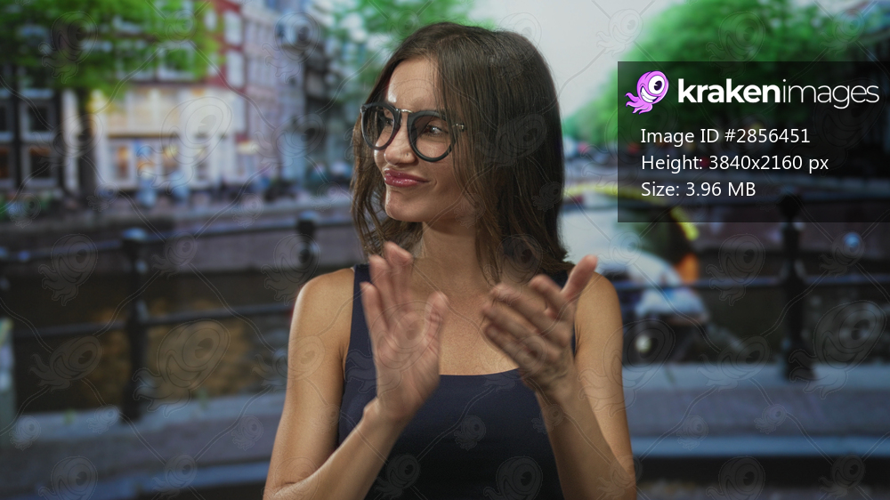 Woman smiling and clapping hands with bare arms wearing glasses on amsterdam street by canal; celebratory joy.