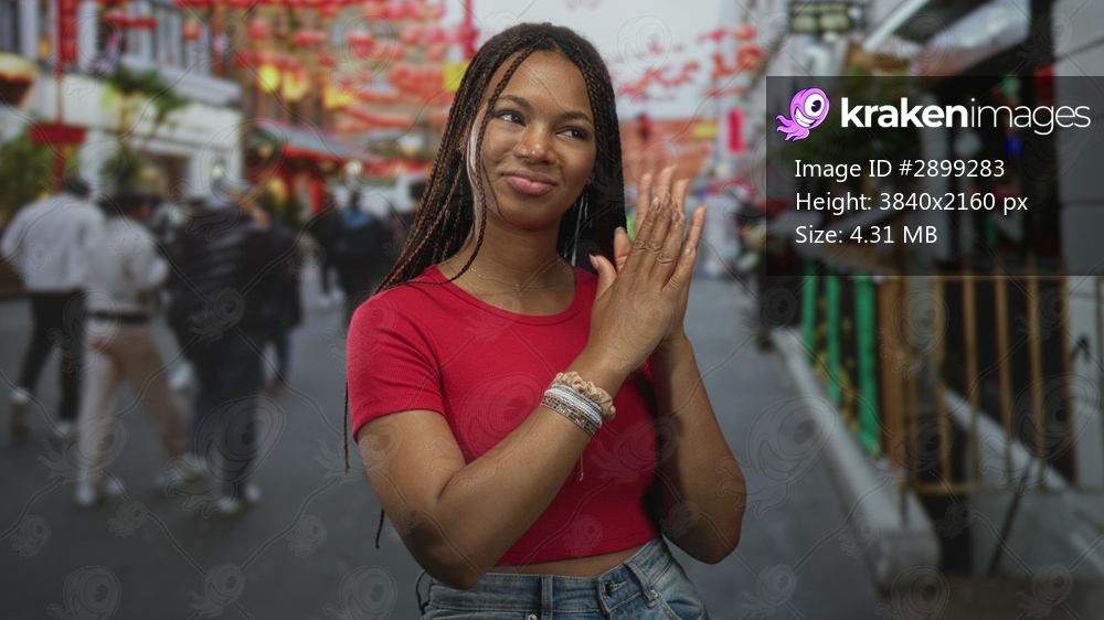 Woman smiling and clapping hands in a red top on a crowded street lined with lanterns and shops; joy celebration community.
