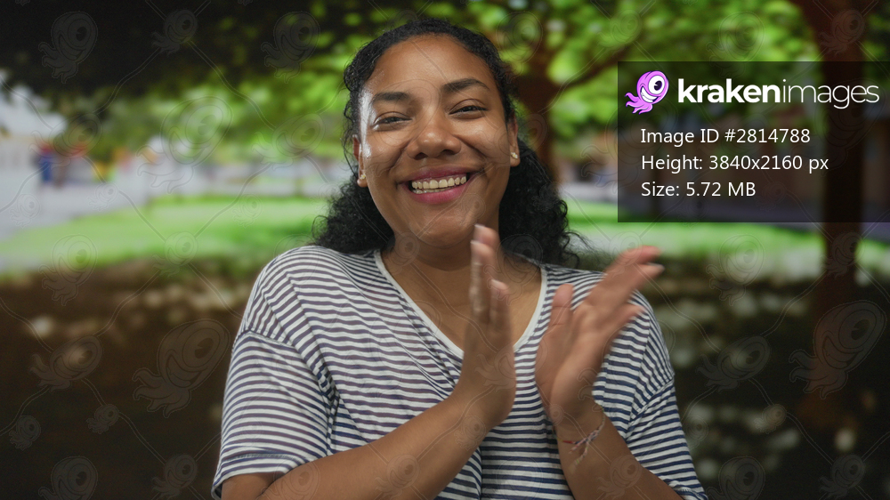 Woman smiling and clapping hands in a sunny city park under green trees during daytime; joy celebration.