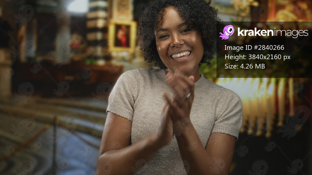 Woman smiling and clapping hands in church aisle under golden candlelight near wooden pews; worship celebration joy faith.