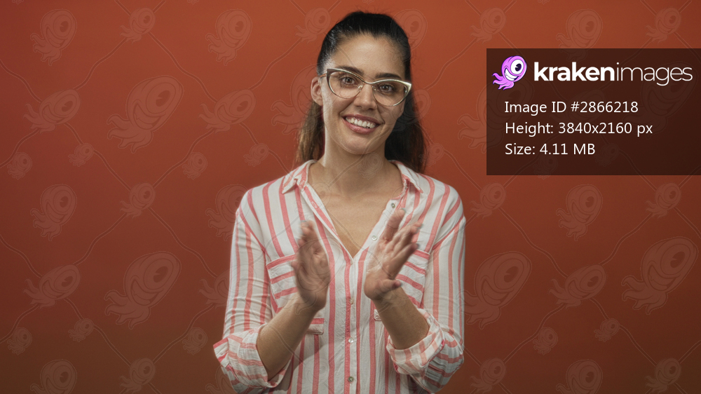 Woman smiling and clapping hands in orange studio, wearing glasses and a pink and white striped shirt with rolled sleeves; joy celebration.