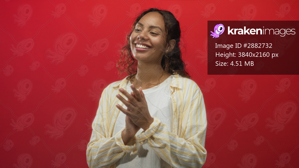 Woman smiling with clasped hands in red studio wearing a striped overshirt and white tshirt, eyes closed in gentle pose; joy.