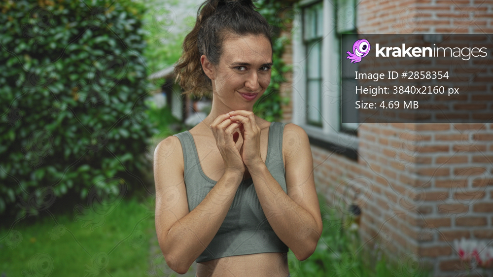 Woman smiling with clasped hands near chest amid green shrubs in front of brick building entrance; playful joy.