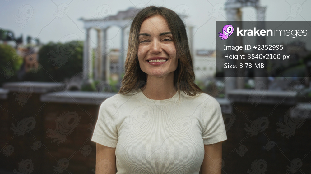 Woman smiling with clasped hands on chest in front of an outdoor building with stone columns; gratitude.