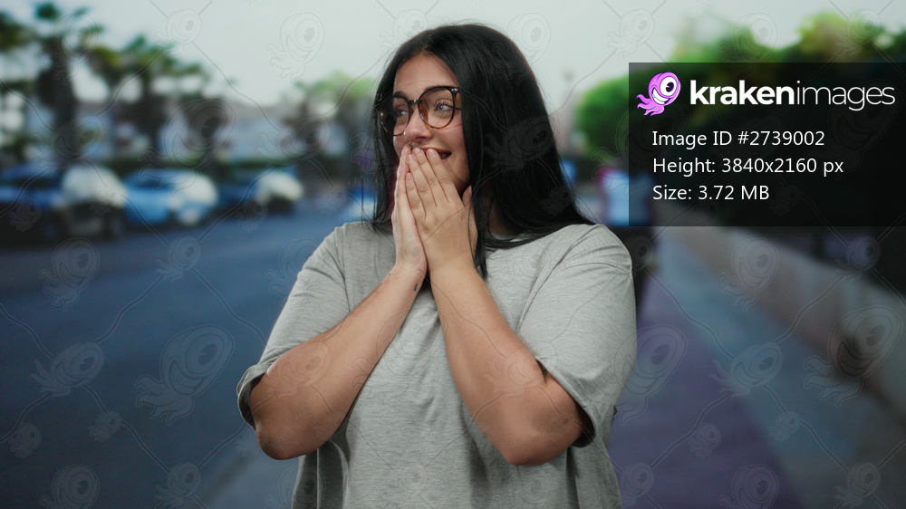 Woman smiling with clasped hands outdoors on a city street showing joy under sunny skies.