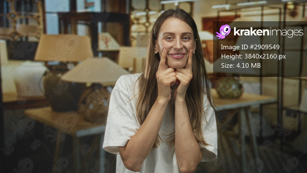 Woman smiling clasping hands in a lamp shop building with multiple table lamps and wearing white t shirt; serenity.