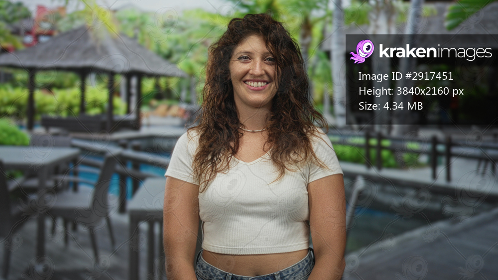 Woman smiling and clasping hands over bare midriff at outdoor resort pool building near a thatched gazebo and lounge chairs by the pool; serenity.