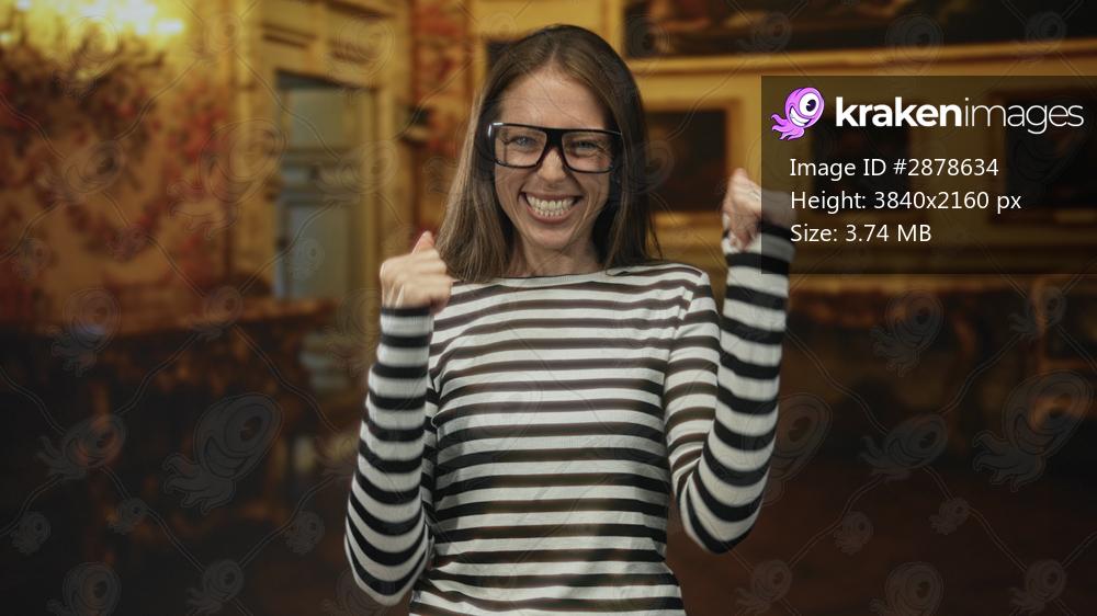 Woman smiling with clenched fists and glasses in museum gallery, striped shirt visible; joy celebration victory.