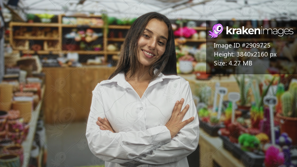 Woman smiling with closed eyes, arms crossed among colorful potted flowers and succulents in building market stall; small business confidence.
