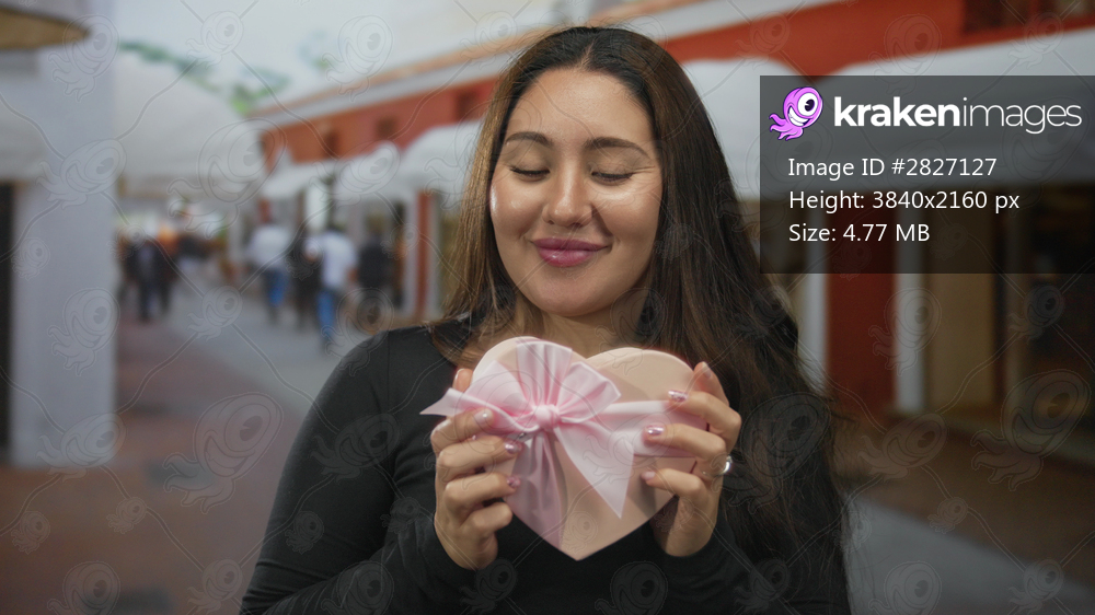 Woman smiling with closed eyes holding a pink heart shaped gift box close to her face on a busy outdoor street; joy.