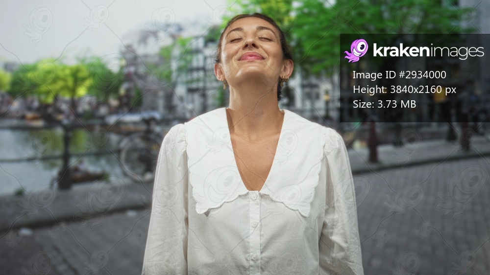 Woman smiling with closed eyes showing face and white blouse on street in amsterdam; contentment travel memory.