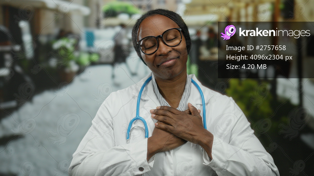 Woman smiling with closed eyes wearing glasses and lab coat, outdoors in a vibrant urban street setting, expressing gratitude with a stethoscope around her neck. - Kraken Images
